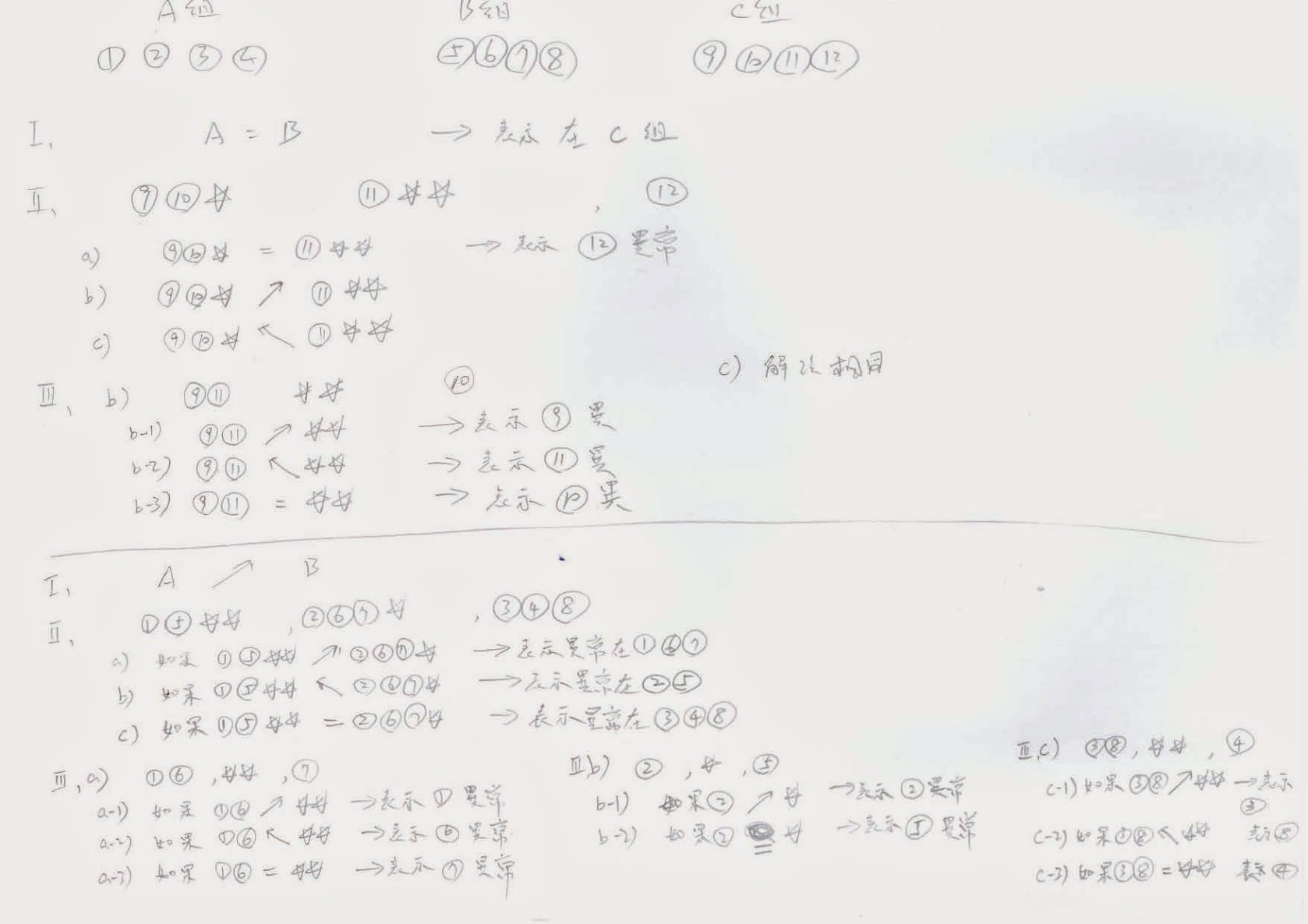 之後如不等重稱過兩組都抓一個人出來加一個沒測過的人。另一組則為測過人員中選擇三人,但不可三人原始同組。剩下很簡單隨便推演都懂了