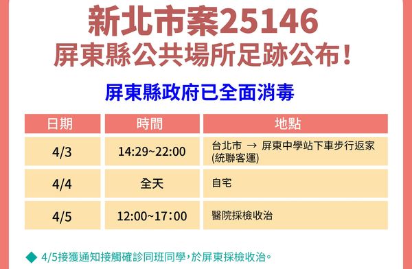 屏東縣政府指出,案25146是在基隆市就讀大學,3日返回屏東親友家,4日接到基隆市衛