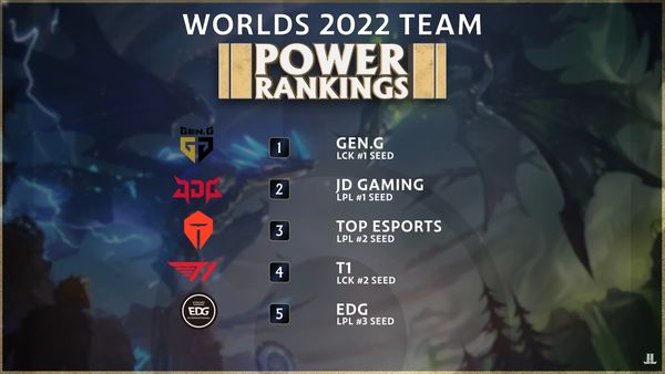 全球各隊實力排行榜。前5名中韓隊伍競爭相當激烈,最終是由LCK王者Gen.G登上第一名