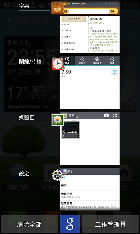 長按首頁鍵叫出的最近應用程式列表,還能夠直接一次清除或是進入工作管理員