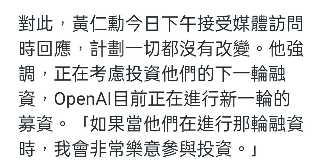 噓 zxm00038: 怎樣黃仁勳有否認跟open的資金鏈問題了嗎1352F 01/31 22:28