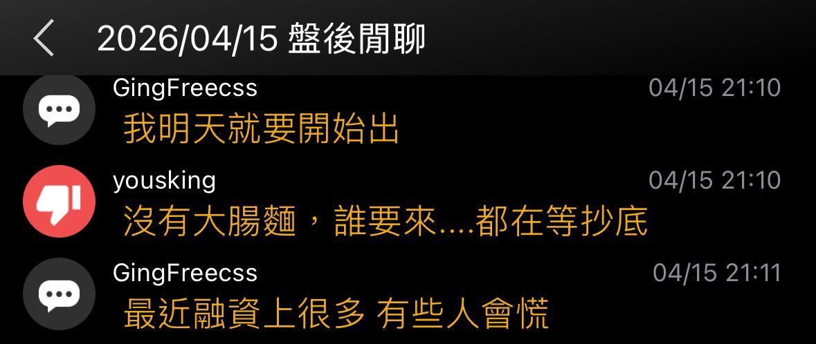 看板 Stock作者 laptic (靜夜聖林彼岸花)標題 [閒聊] 2026/04/16 盤後閒聊時間 Thu Apr 16 14:00:16 2026
