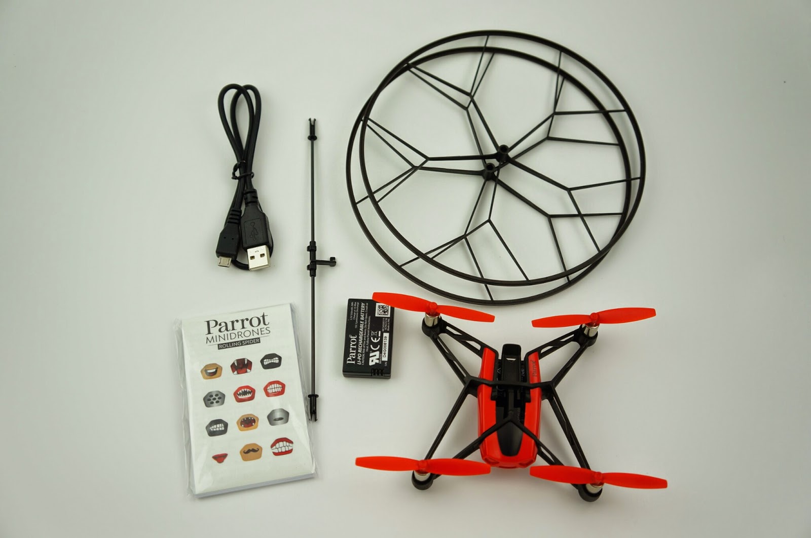 內容物有:Rolling Spider 迷你遙控飛機、兩個輪子跟中軸、電池、Micro USB充電線、
