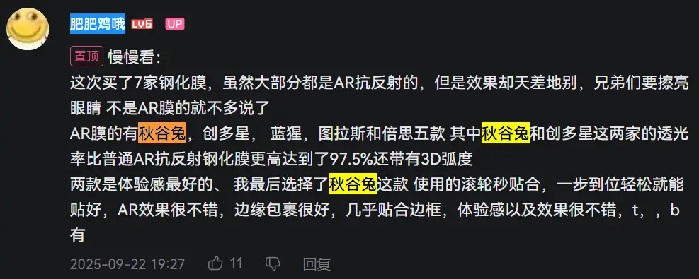 不過我還是先買了前兩年使用心得很好的赤甲(也是AR抗反射,3D熱彎膜),3,4年前用過鐵布衫、藍猩,貼膜和使用體驗沒有很好,價格還都不便宜,所以之後也不會買他們家的今年看到的b站評測比較多是推秋谷兔,尼卡熊