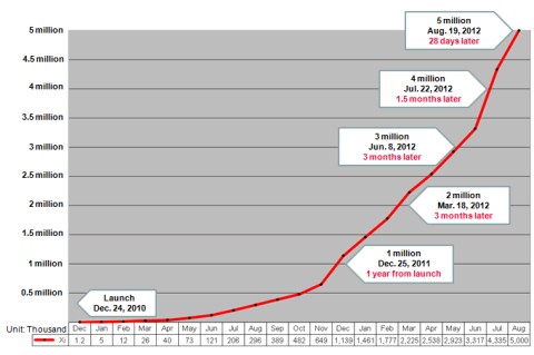 間到2011年12月才達到100萬的門檻,但今年以來用戶數快速成長,3月創下200萬用戶,6