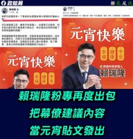 03-03 (Ezimet.) 年底就是九合一選舉,其中高雄市長部分,民進黨立委賴瑞隆在初選勝出,即將代表綠營 參選。只不過近期賴瑞隆出包事件頻傳,今(3)日臉書粉專還有貼錯文,把幕僚建議內 容貼到自己元宵貼文上,事後被臉書粉專「…