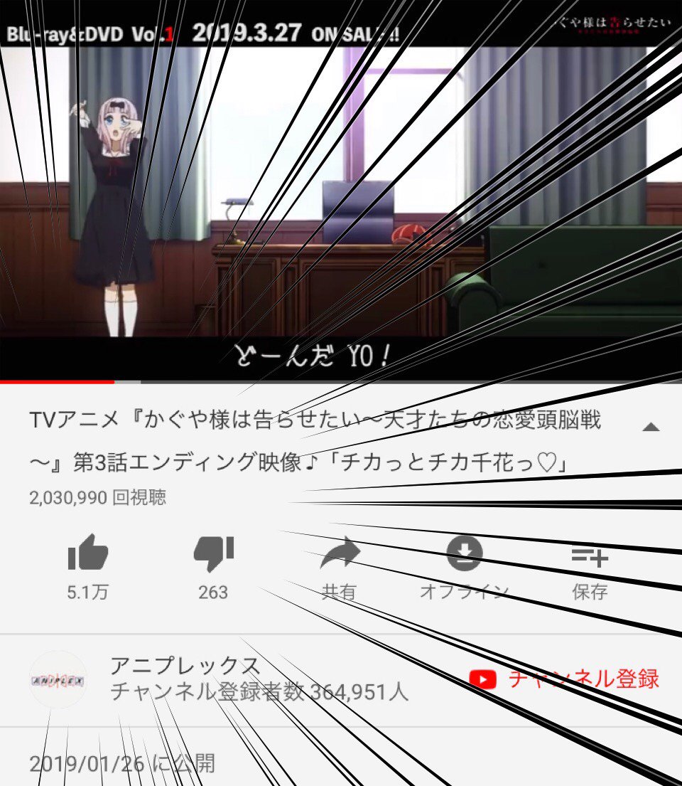 @anime_kaguyaTVアニメ『かぐや様は告らせたい~天才たちの恋愛頭脳戦~』第3話エンディング映像「チカっとチカ千花っ♡」YouTubeでの再生回数が放送から1週間で200万回を突破しました!ありがとうございます#チカダンス まだまだお楽しみください