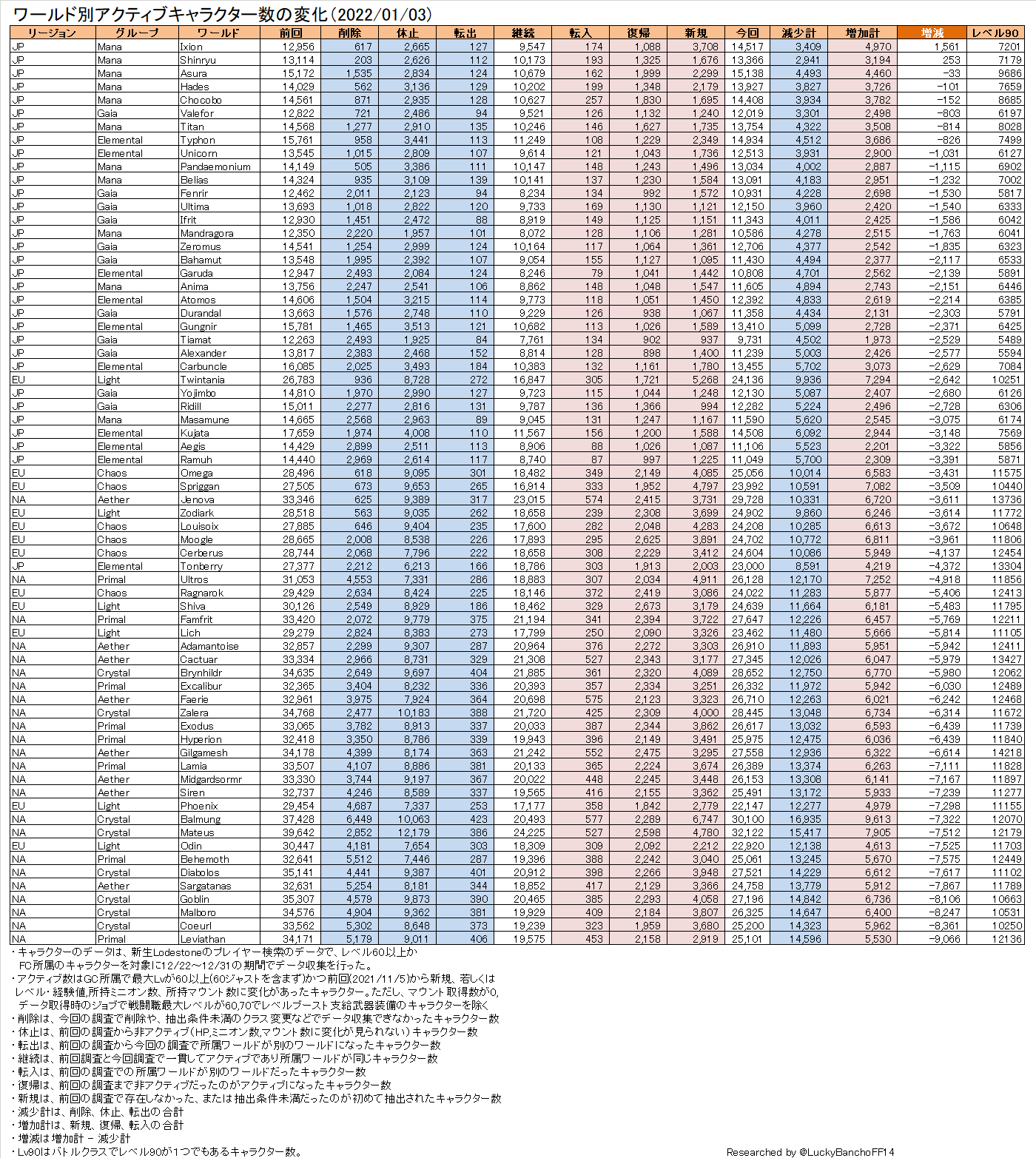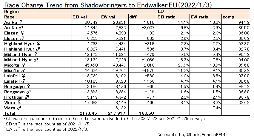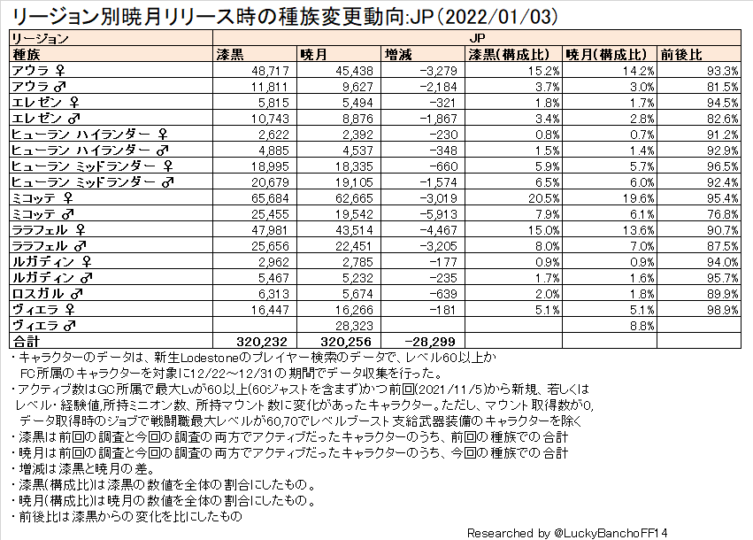 アクティブキャラクターは135万、暁月キャラクターは103万 ワールド別の人口動態 ジョブの人気状況 JP NA EU 種族分布 JP NA EU 先說可能會有矛盾的地方 アクティブキャラクター数は …100F 31推