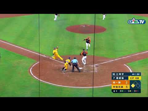 23日中信兄弟與統一獅八局下一出局,兄弟5比2領先,詹子賢在三壘,江坤宇在一壞球時