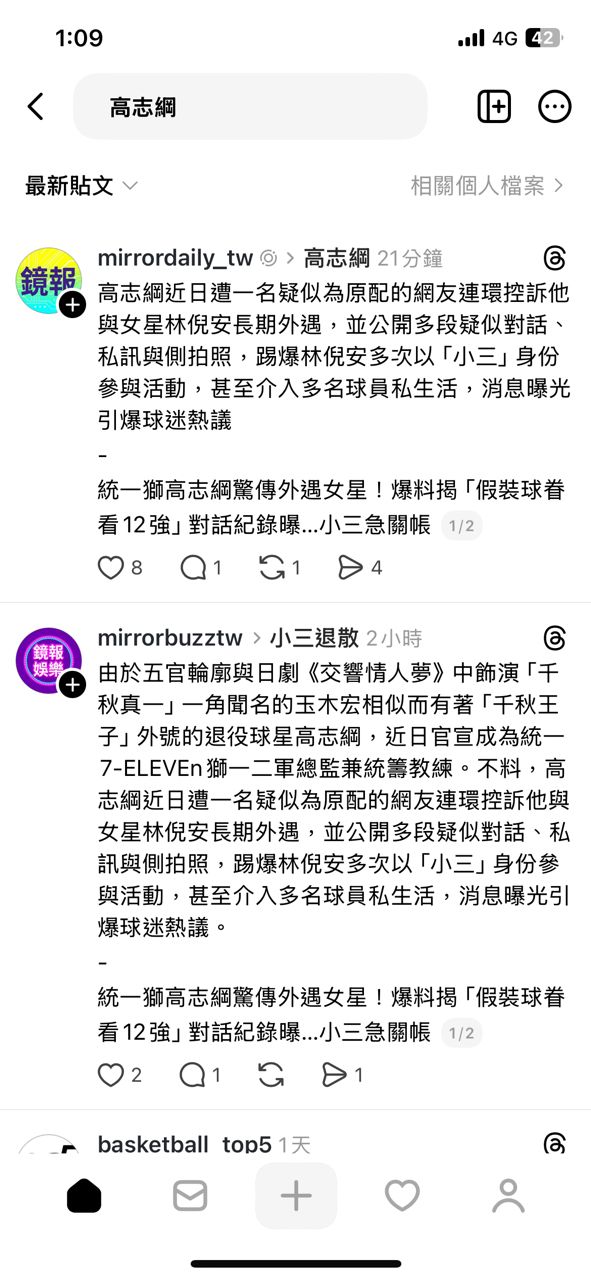 「第三者最基本的是臉皮夠厚,總算見識到。」一名疑似元配的網友持續在Threads發文,控訴高志綱與「林姓小三」長期外遇,怒指女方曾以工作名義,接近多位球員,甚至與多名球員發生關係,後來更貼出小三與老公的對話,崩潰直「你賭我會因為小孩不敢離開……你自己是媽媽不覺得非常惡毒嗎?」