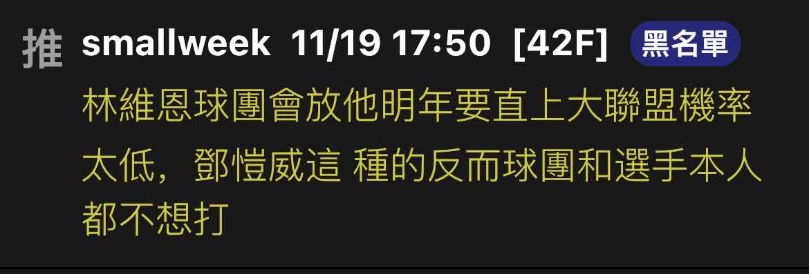 → : 老虎球團一定會勸退李灝宇,如果國際賽影響他上MLB120F 11/27 14:51