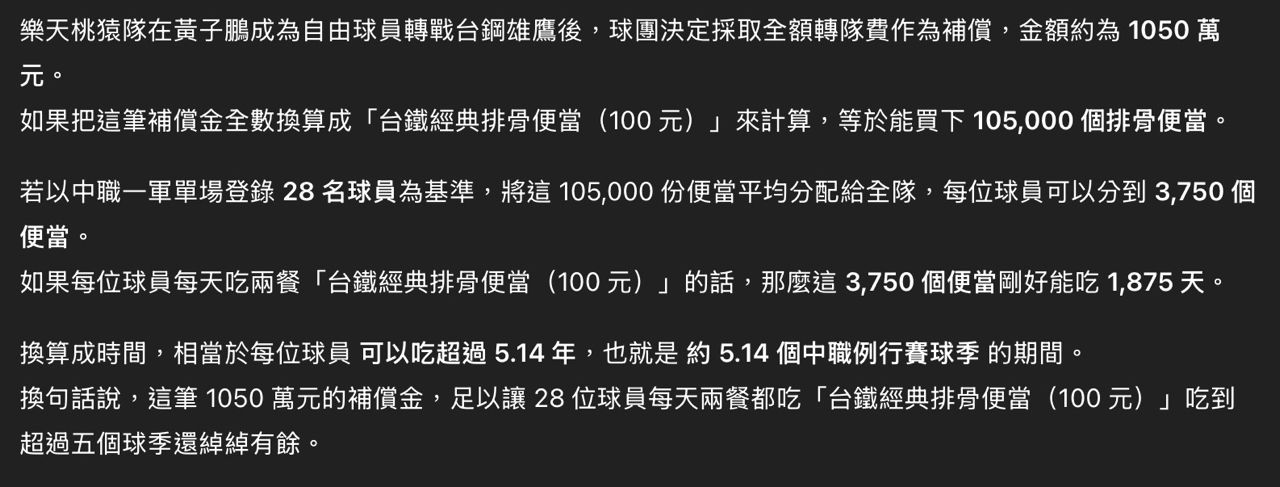 隊費為補償,按照黃子鵬月薪推算,猿隊補償金將落在1050萬元,約可購買8萬4000個梁社