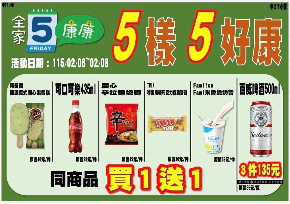 【活動名稱】:全家會員獨享&康康五 【便利商店/廠商名稱】:全家便利商店 【活動時間】:2026/2/04~2026/2/08 【活動內容】: 2/04~2/08會員獨享 2/06~2/08康 …35F 24推