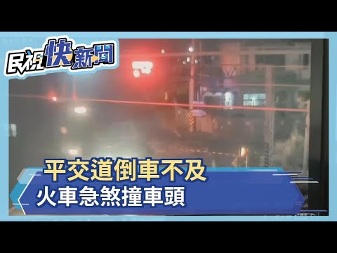的Toyota altis,因闖越平交道與電聯車相撞,幸好僅車頭前方受損,女駕駛有胸悶情形