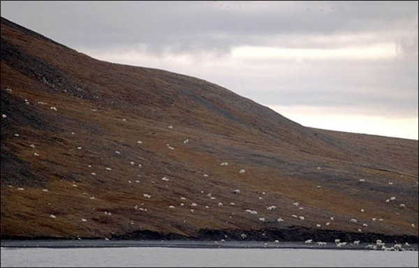〔即時新聞/綜合報導〕北極熊深受全球暖化影響,被列為瀕臨絕種動物,但在俄羅斯北冰洋的弗蘭格爾島(Wrangel),近日出現驚人一幕,整座島上230隻北極熊幾乎都現身,原來1隻鯨魚在岸邊死亡,數量眾多的北極熊便前來享用盛宴。