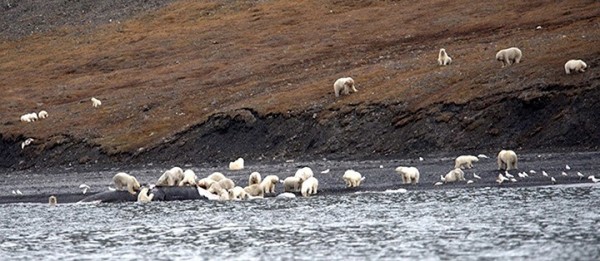 據《西伯利亞時報》報導,航船旅客從遠方望向島嶼,看到島上遍布白色動物,原本還以為是羊隻,結果竟然都是北極熊。不僅有母熊帶著幼崽前來飽餐,單身的北極熊不論雌雄,也參與了這次鯨魚饗宴。