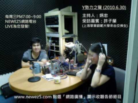 炳忠主持網路電台節目"Y勢力之聲"2010.6.30播出之內容節選。本集炳忠專訪華東師範大學來台交換學生許子蘭,與大陸學子交換彼此生活的經驗與感受。"Y勢力之聲"每周三PM7:00~9:00在NEWEZ5網路電台LIVE播出,由炳忠號召年輕人發出不同觀點,用年輕的心關懷家國社會。收聽方式:www.newez5.c...