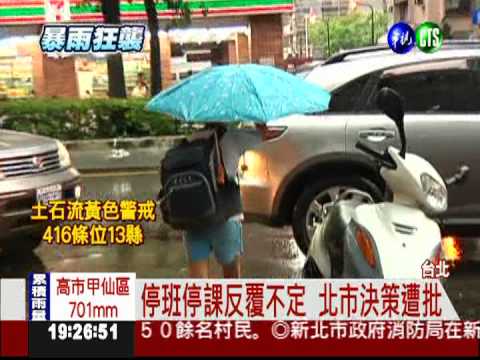 全台豪大雨,但政府宣布停班停課卻慢半拍。台北市政府直到上午十點鐘,才突然宣布"即刻"停班停課,家長措手不及,從公司趕到學校接小孩,破口大罵政府在整人,而台北市長郝龍斌解釋,這麼做家長才有充裕時間接小孩。