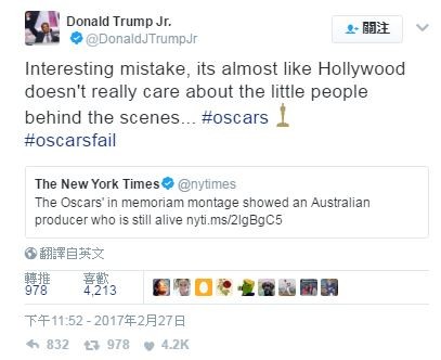 雖然川普本人這次並沒有親自發推來酸奧斯卡大烏龍,不過他的兒子小唐納川普已經代他