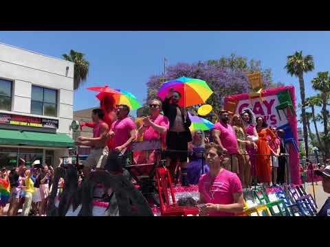 印有彩虹的衣服,手舉彩虹旗,在聖塔蒙尼卡大道(Santa Monica Blvd.)上遊行,上百