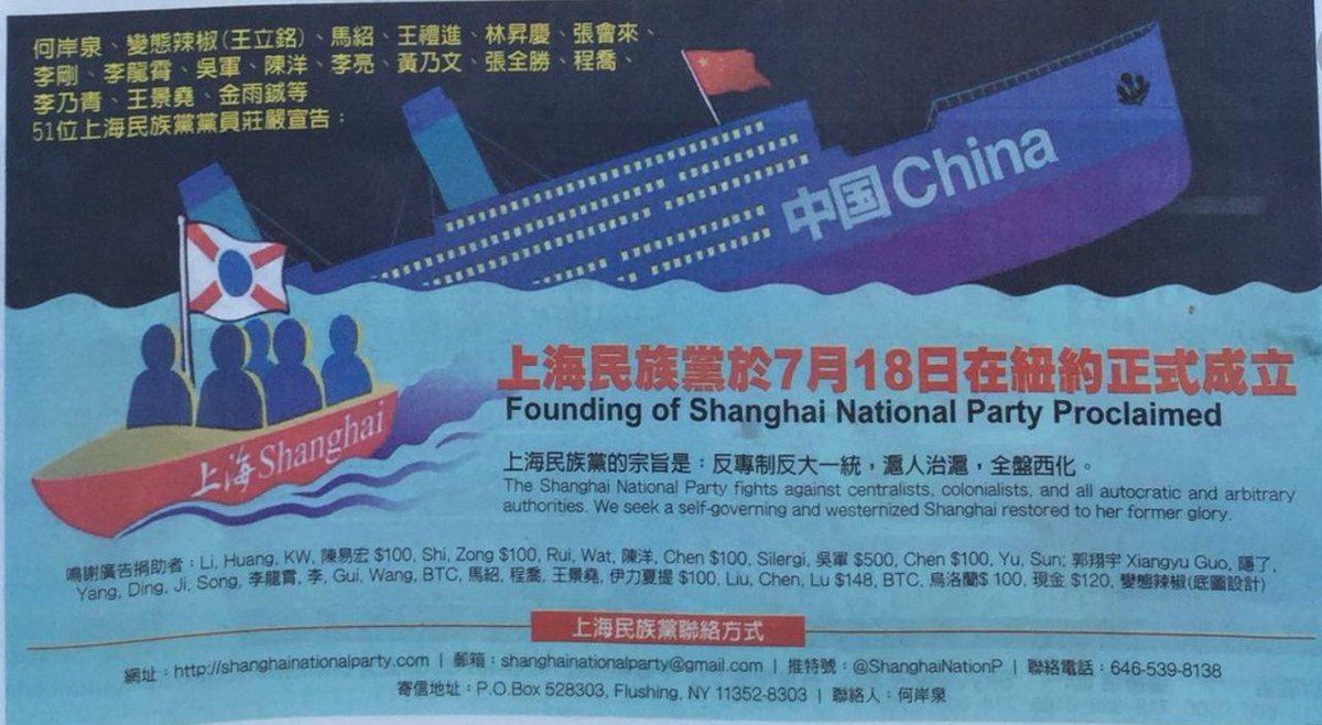 頭版廣告——- #上海民族黨宣布正式成立。並向大紐約地區粉紅粉紅的愛國華人獻上辱