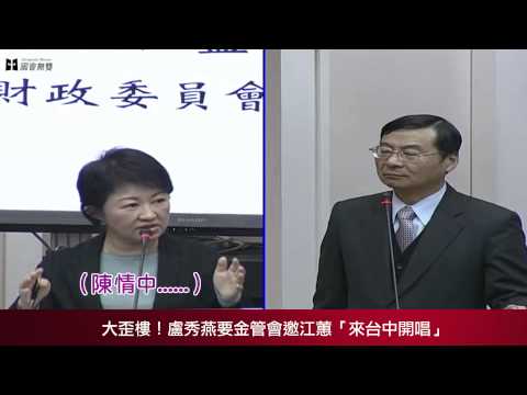 【國會無雙界外球】大歪樓!盧秀燕要金管會邀江蕙「來台中開唱」1/8 - YouTube 江蕙演唱會太熱門,讓立委歪樓替鄉親要門票! 今(8)日,立法院財政委員會審查金管會轄下財團法人預算,國民黨籍立法委員盧秀燕上台質詢,但在稱金管會主委曾銘宗一聲「表哥」後,卻開始為台中鄉親請命,要曾銘宗邀請江蕙來台中開演唱會,不然也替台中鄉親多拿一點孝親票,曾銘宗也十分配合地說「昨(7)日打了電話,江蕙說會慎重考慮...