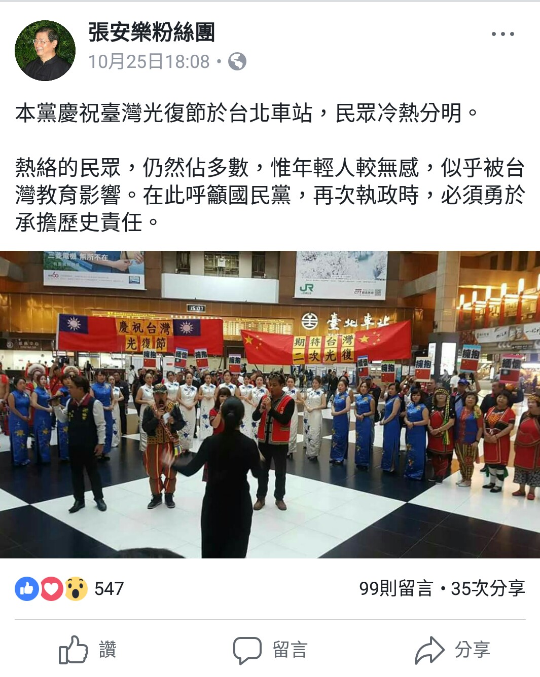 作者 標題 [FB] 張安樂:本黨慶祝光復節 年輕人較無感