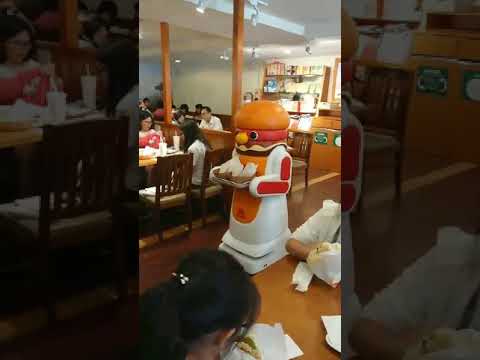 該影片於台北市民權西路摩斯餐廳拍攝,影片中機器人端著餐點,自動送到指定客人桌旁