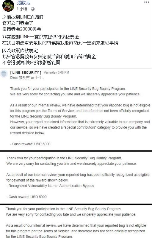張啟元這次替通訊軟體LINE找到漏洞,獲得官方頒予60多萬台幣,今於臉書發文,表示對