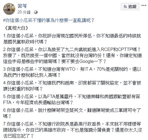 苦苓今日在個人臉書上先是以「你這個小瓜呆不懂的事為什麼要一直亂講呢?」為題,列