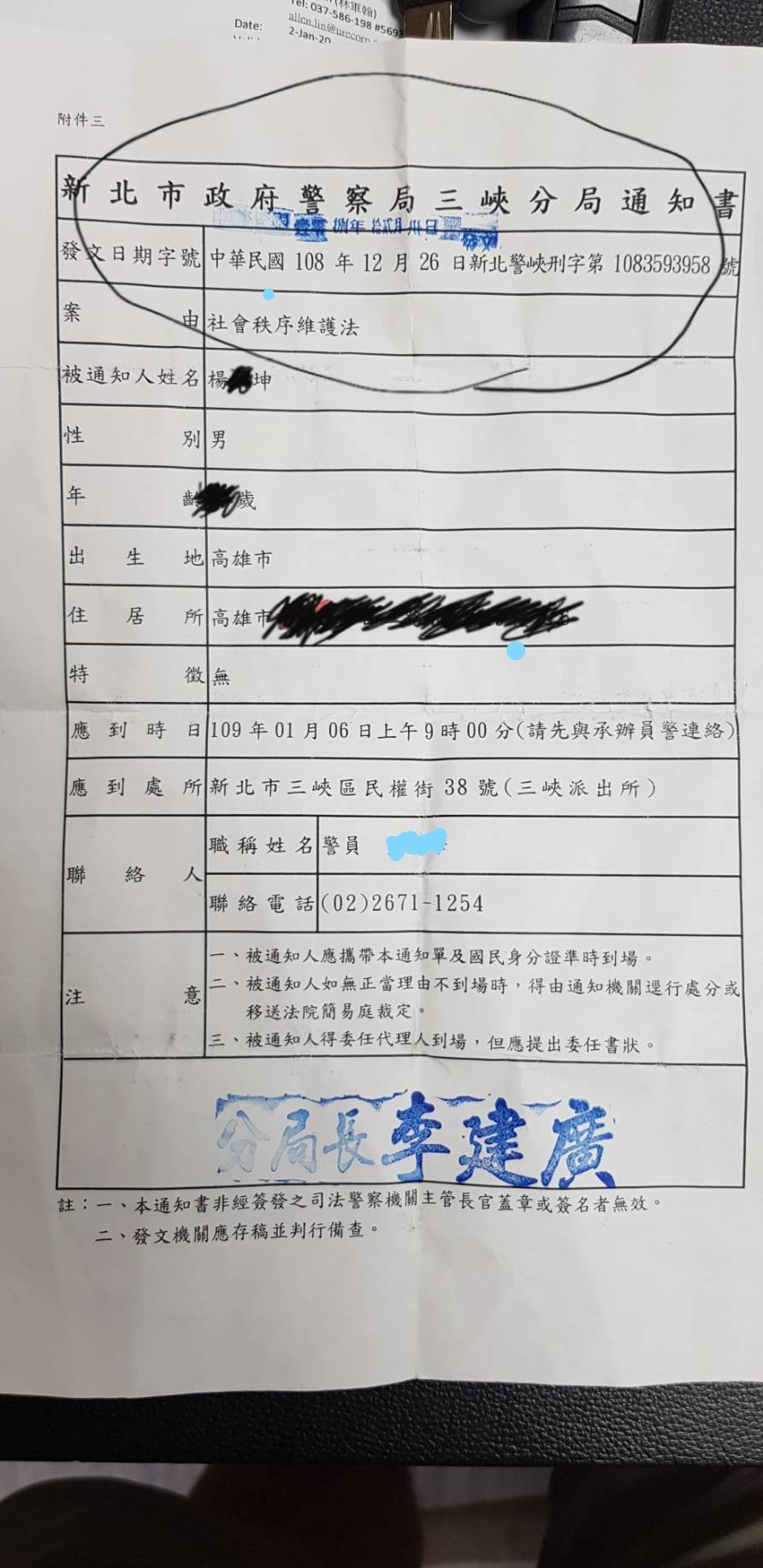 兩名三峽派出所的員警來找他,遞出一張違反社會秩序維護法的筆錄通知書,認為他日前
