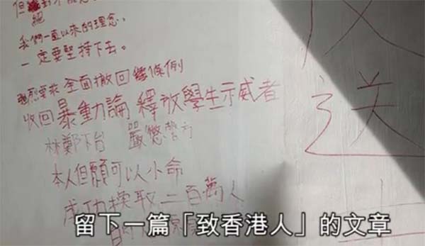 壁上,用紅筆寫下「反送中」口號及近一百字的文章,內容提及「…強烈要求全面撤回條