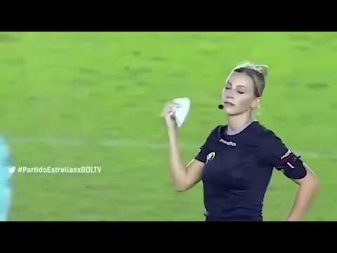 Fernanda Colombo)以嚴肅的神情看著足球員,還作勢從口袋拿出黃牌警告,結果只是從
