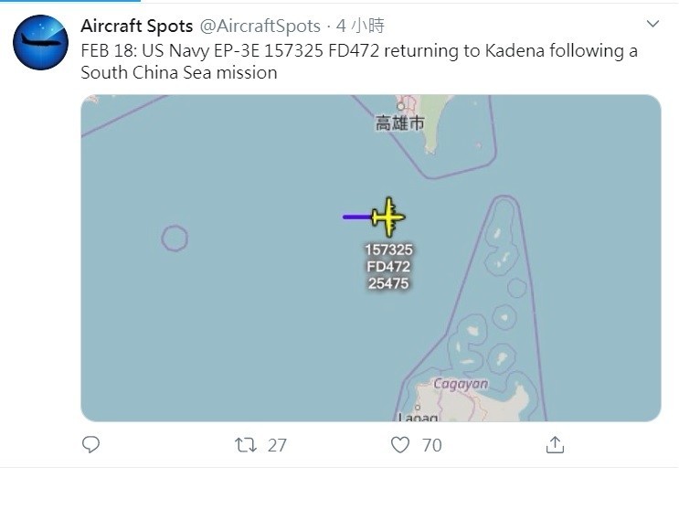 美國軍機、軍艦本月以來頻密在台灣周遭海空域進行演習,反制中國意味濃厚。長期追蹤國際飛機動向的推特帳號「飛機守望」(Aircraft Spots)18日提供的飛行路線顯示,一架隸屬於美國海軍的EP-3E「白羊座」電子偵察機在南海上空進行了飛行,隨後沿台灣南面海域,飛回駐日美軍的嘉手納空軍基地。從飛行路 ...