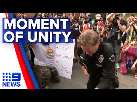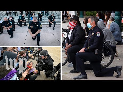 不知道是誰開始的,全美不少地方的警察發起向示威者單膝下跪的和解姿勢: