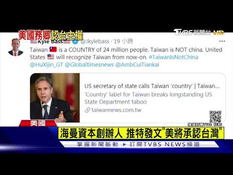 就連美國對沖基金大鱷海曼資本的創辦人巴斯,也在推特上分享相關新聞,提到台灣是一個擁有2400萬人口的國家,國家還用全大寫特別強調,接著寫下,台灣並不是中國,而且美國將會承認台灣的地位,還特別在文末tag中國駐美大使崔天凱。