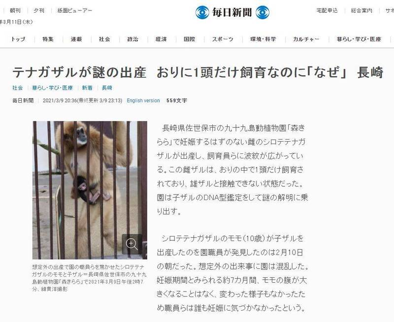 首次上稿 03-10 23:37更新時間 03-11 06:30日本長崎縣佐世保市的「九十九島動植物園森閃閃」,有一隻母長臂猿懷孕並生下小寶寶,但園方對此非常困惑,因為這隻長臂猿長期單獨被關在籠子內。 ...