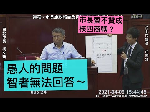 台北市議員苗博雅日前在議會要求台北市長柯文哲,針對是否同意重啟核四商轉表態,引