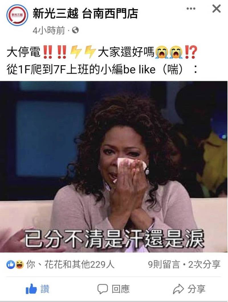 停電苦中作樂 百貨小編飆汗爬7樓發梗圖:分不清是汗還是淚