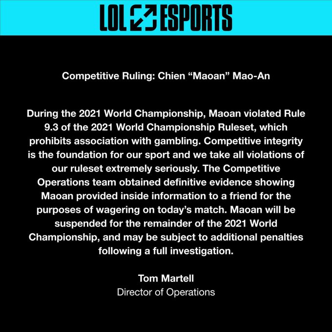 During the 2021 World Championship, Maoan violated Rule 9.3 of the 2021 World