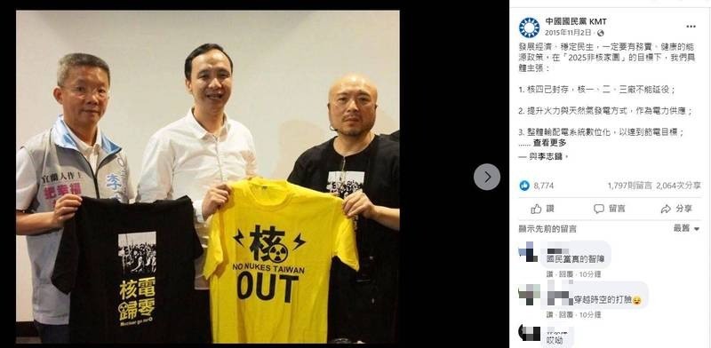 國民黨6年前在臉書表態反核的貼文被網友挖出,挨批理念自相矛盾前後不一。 圖:翻