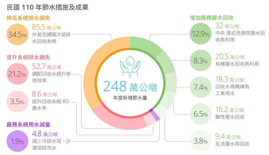 民國 110 年,台積電透過節水措施維持製程用水穩定,整體回收系統增加 248 萬公噸節