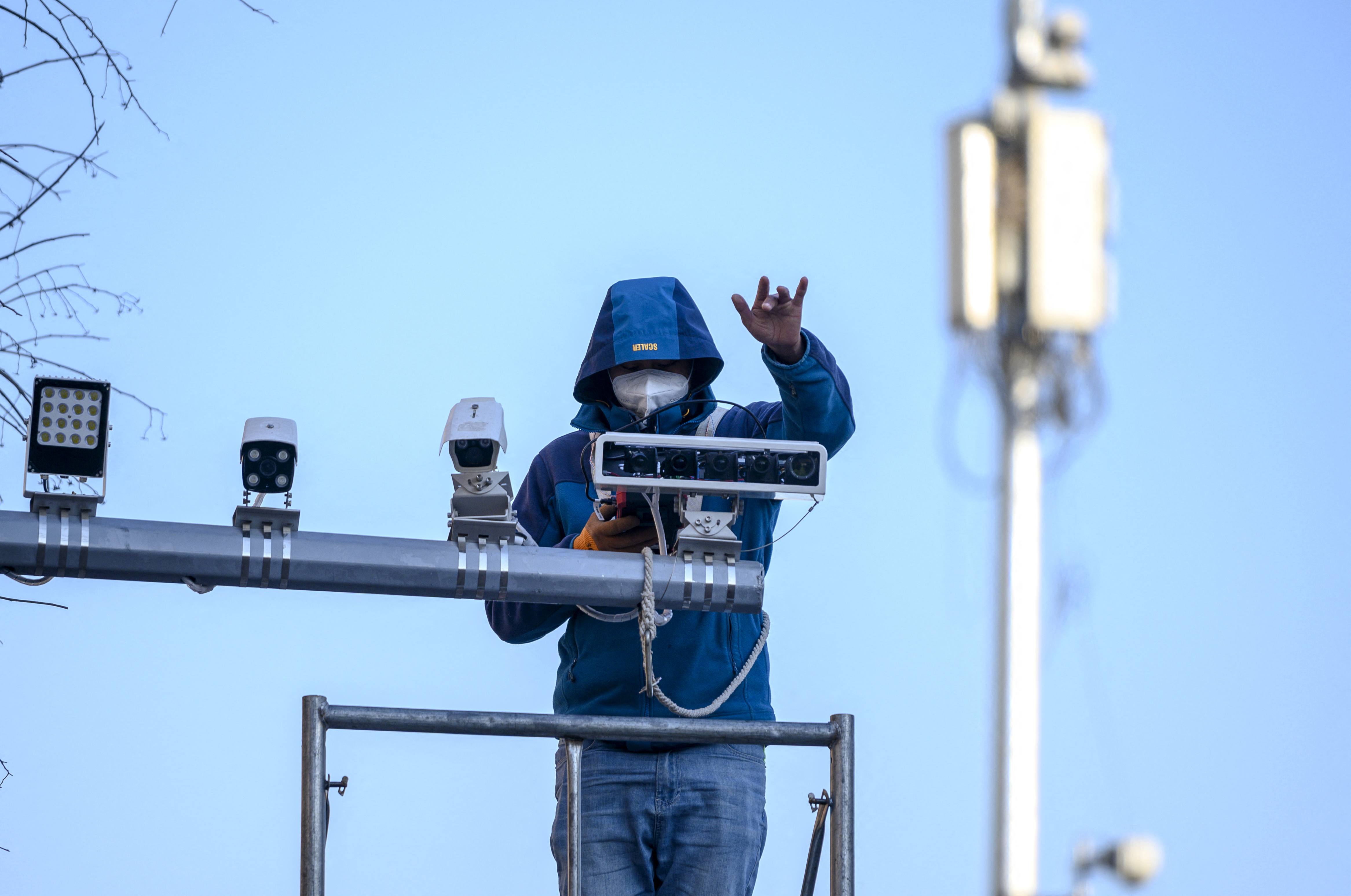 12月16日,一名工人在北京的一個街道上安裝閉路電視攝像機。 (Noel Celis/AFP)