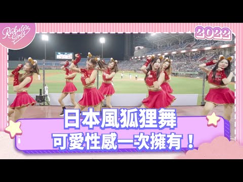 ,台灣樂天女孩身穿紅色隊服跳「狐狸舞」,頭上的狐狸耳朵,還是日本火腿隊提供的。