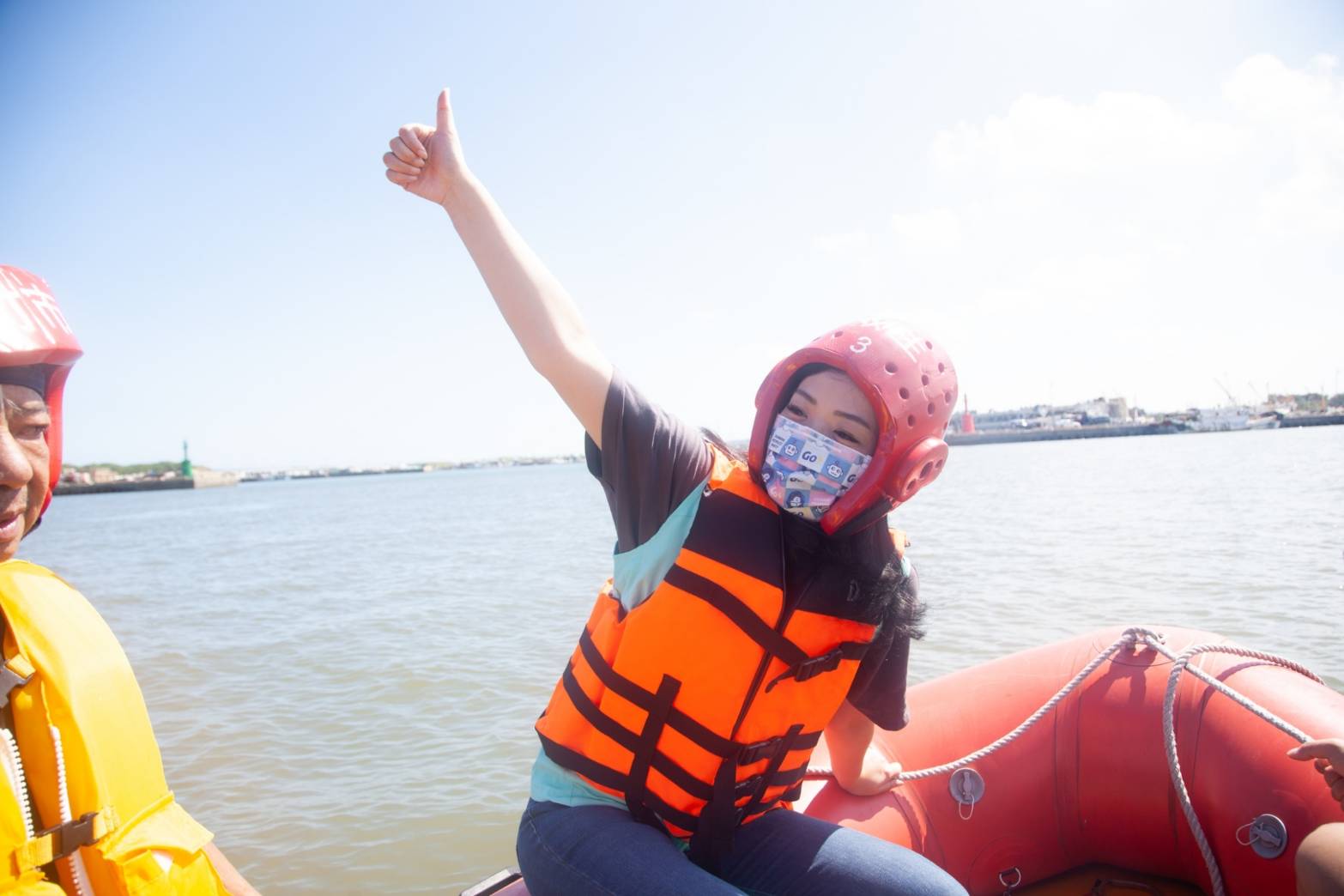 還親自穿救生衣,下海搭橡皮救生艇感受同仁們救生操練課程的辛苦,現場還有一隻救生