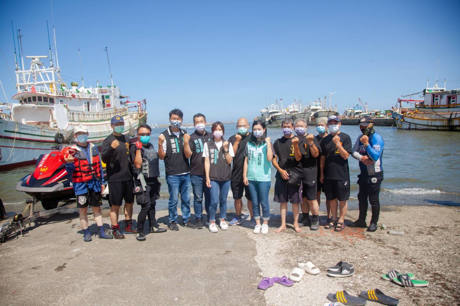 高虹安今天參加新竹義消水上救生訓練營,為前來南寮漁港碼頭訓練的義消弟兄們打氣,