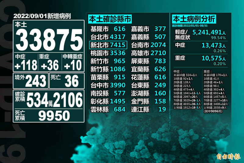 本土+33875上升25.6% 死亡+36、境外移入+243 - 生活 - 自由時報電子報