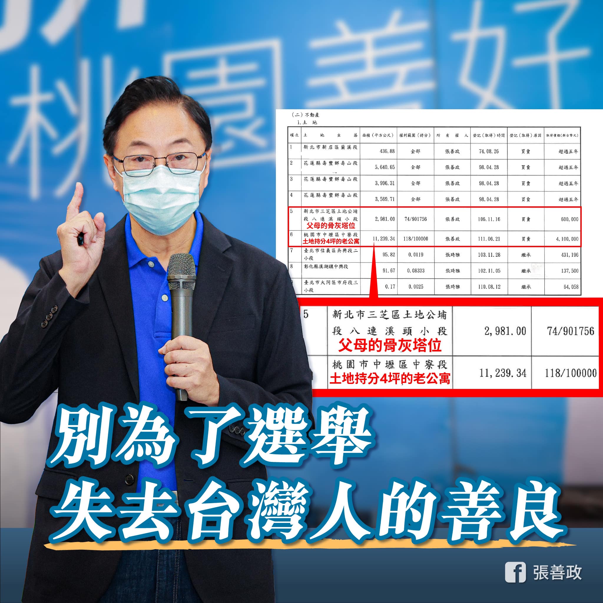 不動產66筆!張善政親駁「土地公說」 轟綠營混淆視聽