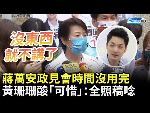 台北市長候選人公辦政見發表會於12日登場,國民黨候選人蔣萬安在說完之後,時間還剩下5分鐘,引發外界議論。對此,無黨籍台北市長候選人黃珊珊今(13)日受訪時就嘲諷表示,蔣萬安好像是照稿子唸,唸完後沒東西就沒有講了。 ...