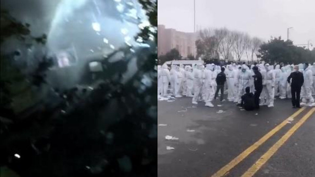 員工染疫等,因感覺被富士康欺騙,憤而聚集要衝出大門,遭到警方鎮壓,畫面非常混亂